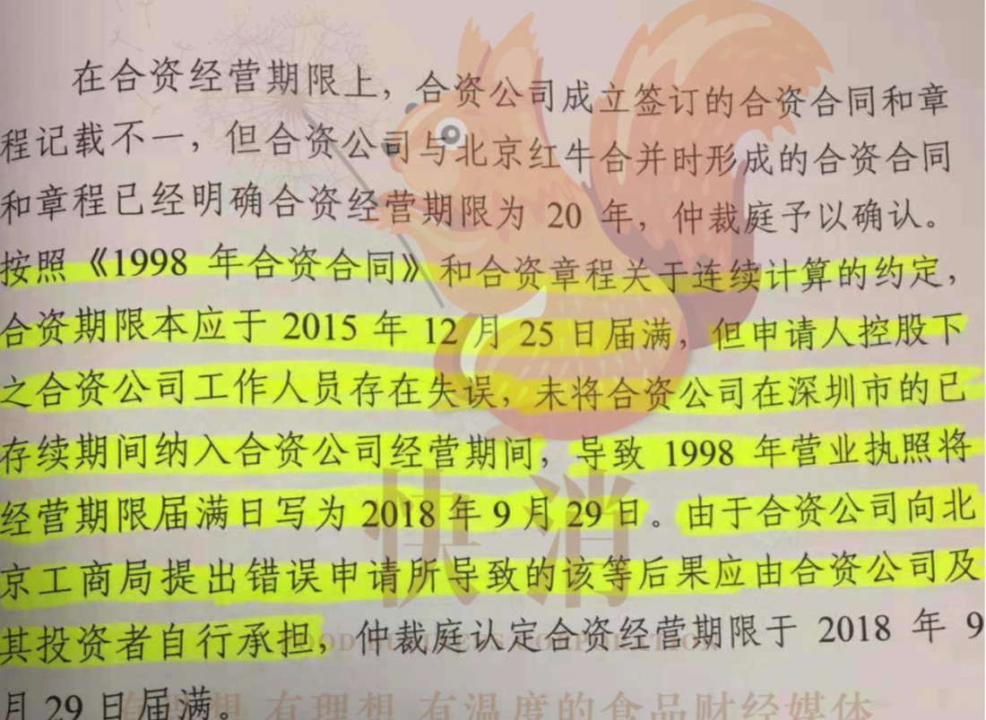 快消记者获取的一份《仲裁书》截图显示,“按照《1998年合资合同》和合资章程关于连续计算的约定,合资期限本应于2015年12月25日届满,但申请人(泰国红牛)控股下之合资公司工作人员存在失误,未将合资公司在深圳市的已存续期间纳入合资公司经营期间,导致1998年营业执照将经营期限届满日写为2018年9月29日。由于合资公司向北京工商局提出错误申请所导致的该等后果应由合资公司及其投资者自行承担。仲裁庭认定合资经营期限于2018年9月29日届满。”
