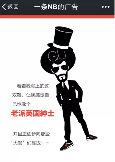 ——New Balance请网络意见领袖:顾爷(他以一个艺术爱好者的身份,用独具一格的形式向读者讲那些高雅的画作,以此闻名),在他的微信公众号“顾爷”上发布:“一条NB的广告”,讲述了他对鞋的怀旧之旅。最后顾爷求大家测试“型格”:发现NB型生代。通过一组测试题,测测你是雅痞文青李大齐,还是鬼马宅客陈吰。
