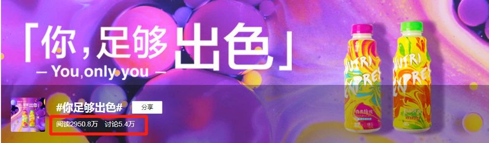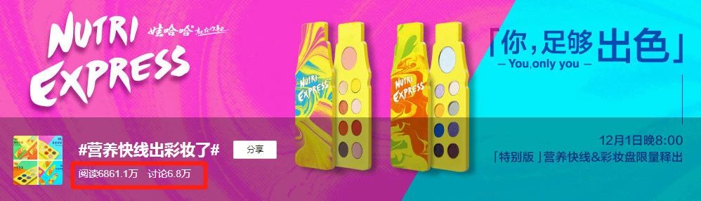 事实也证明,取得了很不错的效果。在微博上,很快就引发了#营养快线出彩妆了#、#你足够出色#、#娃哈哈彩妆#等话题互动。阅读量累计达1.16亿,讨论量逾12万。
