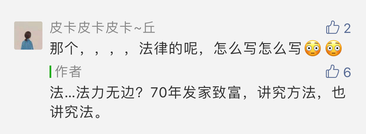 于是就有了“70年发家致富,讲方法,也讲法”,当然你如果觉得“发家致富”太野了,可以说“发展经济”或者“搞建设”啥的。
