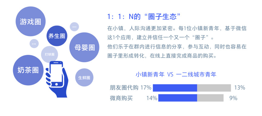 虽然小镇新青年们在审美需求与消费标准上逐渐与线上潮流看齐,但是,同时,地缘关系又深刻而持久地影响着他们。小镇生活,人际关系交往紧密,社交动态线上与线下异常同步,尤其是微信等社交工具的应用,更进一步地帮助他们沉淀了一个又一个精细化的圈层。报告显示,74%小镇新青年的资讯来源于社交媒体,37%在消费时会受到社群影响。