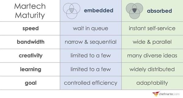 embedded模式和absorbed模式之间的主要区别在于,核心营销运营团队之外的营销人员能够在多大程度上能够自助适应与Martech相关的需求。
