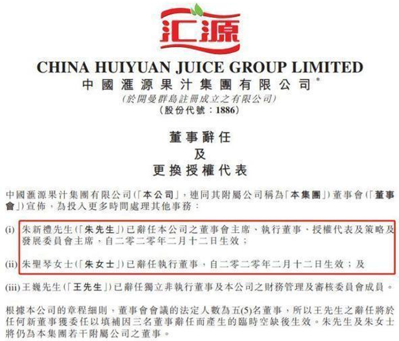 在汇源帝国的瓦解声中,汇源迎来了它28年发展史上最大的一次人事变动。2020年2月12日,朱新礼和女儿双双退出汇源。2月14日,汇源被取消上市地位。汇源一直都是朱新礼的汇源,没有了他,汇源该何去何从?