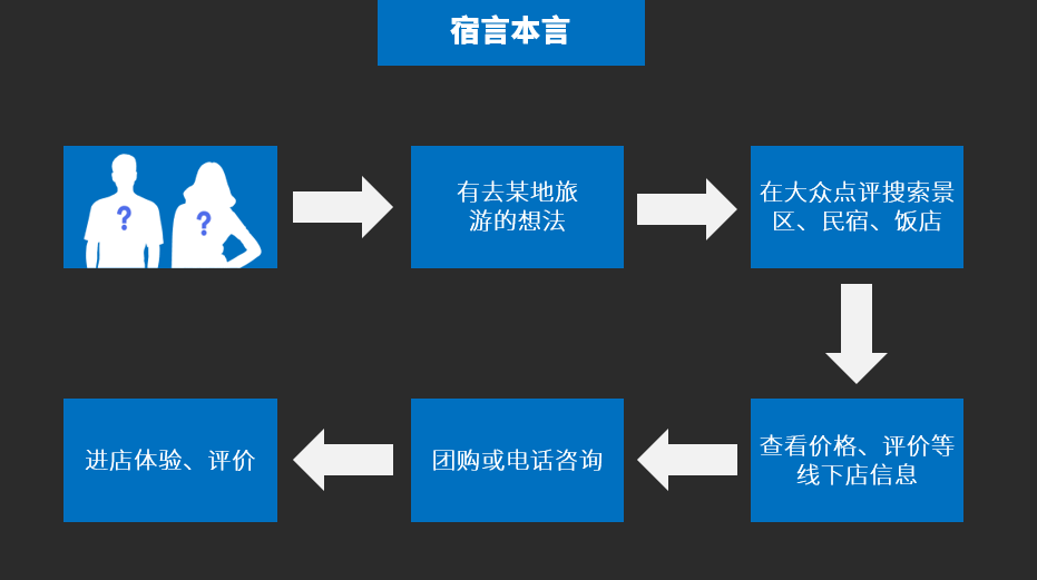 饭店、民宿类的线下店的线上引流首先要做的就是“大众点评”,理由非常简单,那就是去大众点评搜索的人基本都是有意向的用户。现在年轻人大众点评的搜索习惯如下: