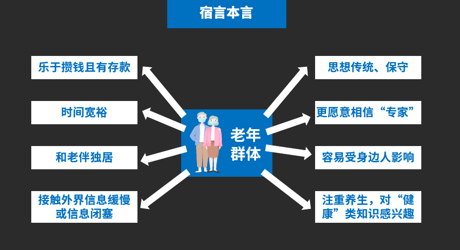 ”,随着中国步入老龄化社会,老年人市场也逐渐被商家重视起来。老年群体的特征是有钱、有闲、孤独、信息闭塞、思想传统、相信专家等。保健品的产品品类也都是围绕老年人的特性“