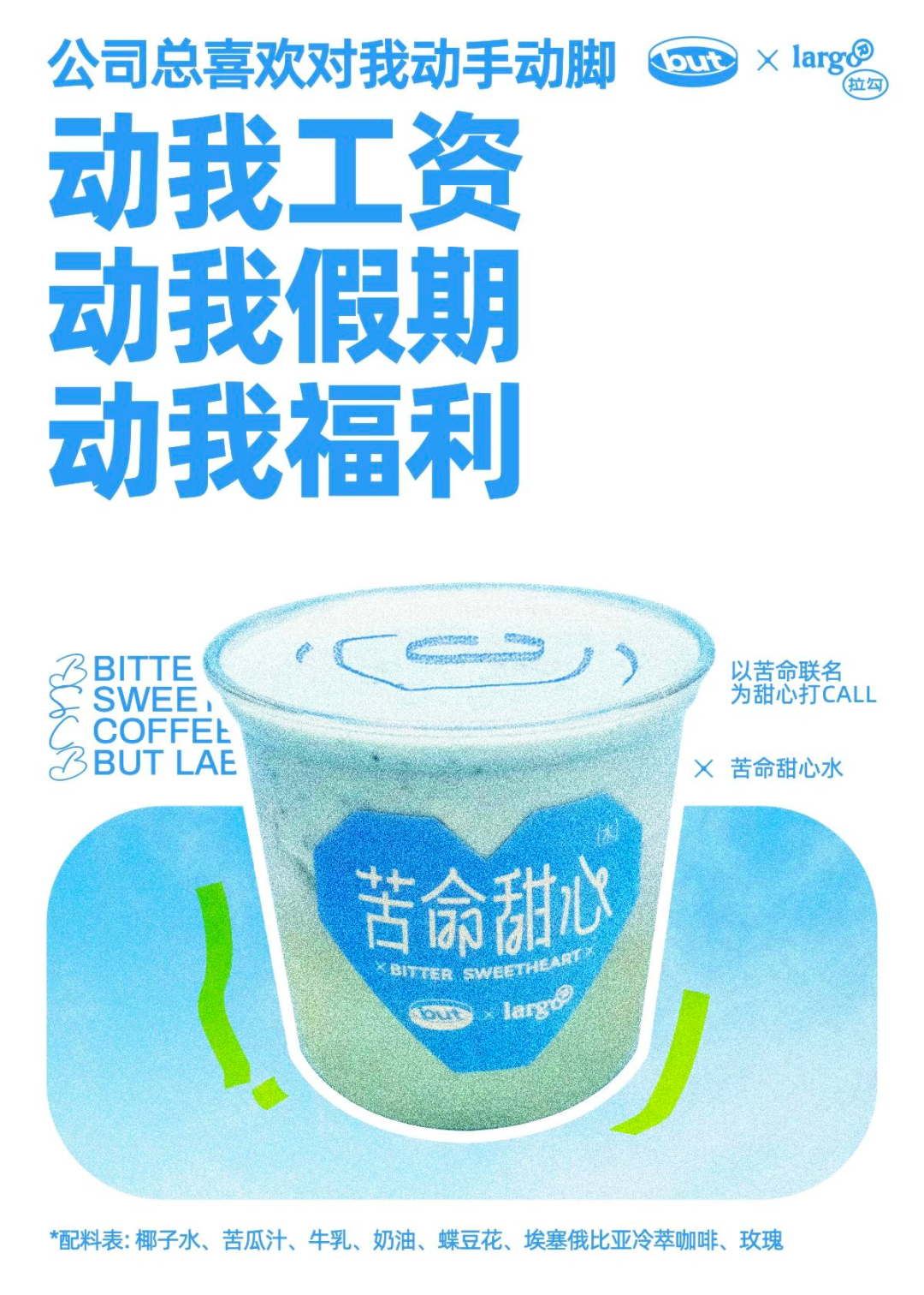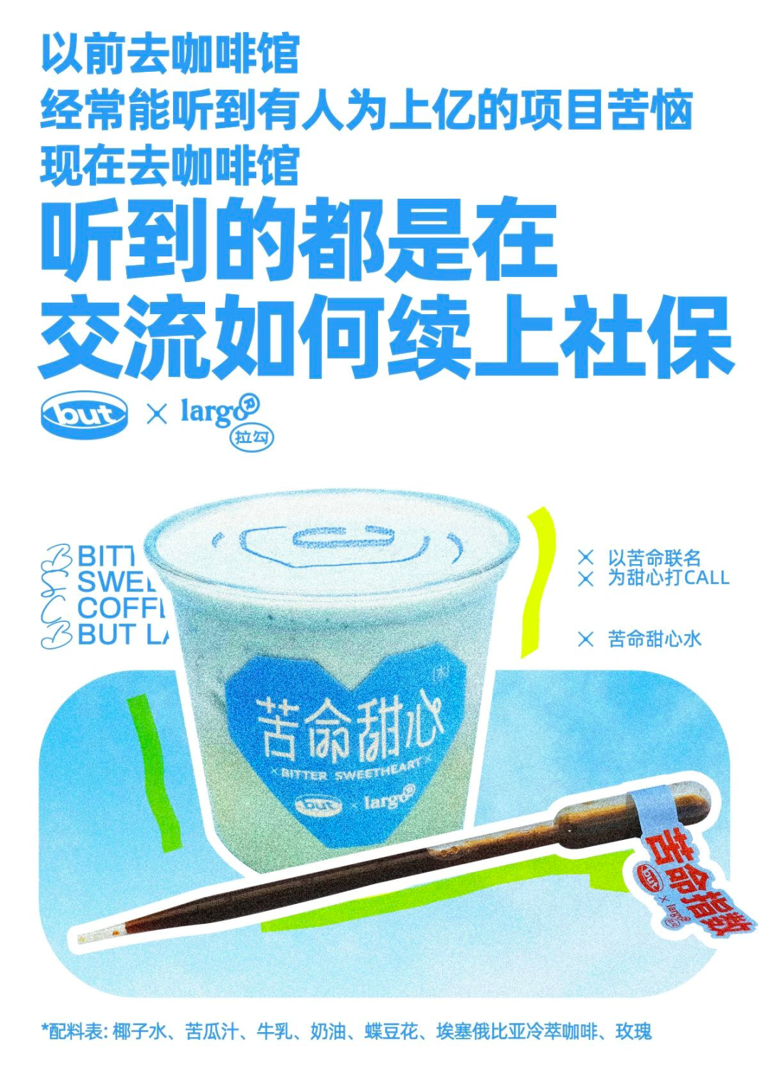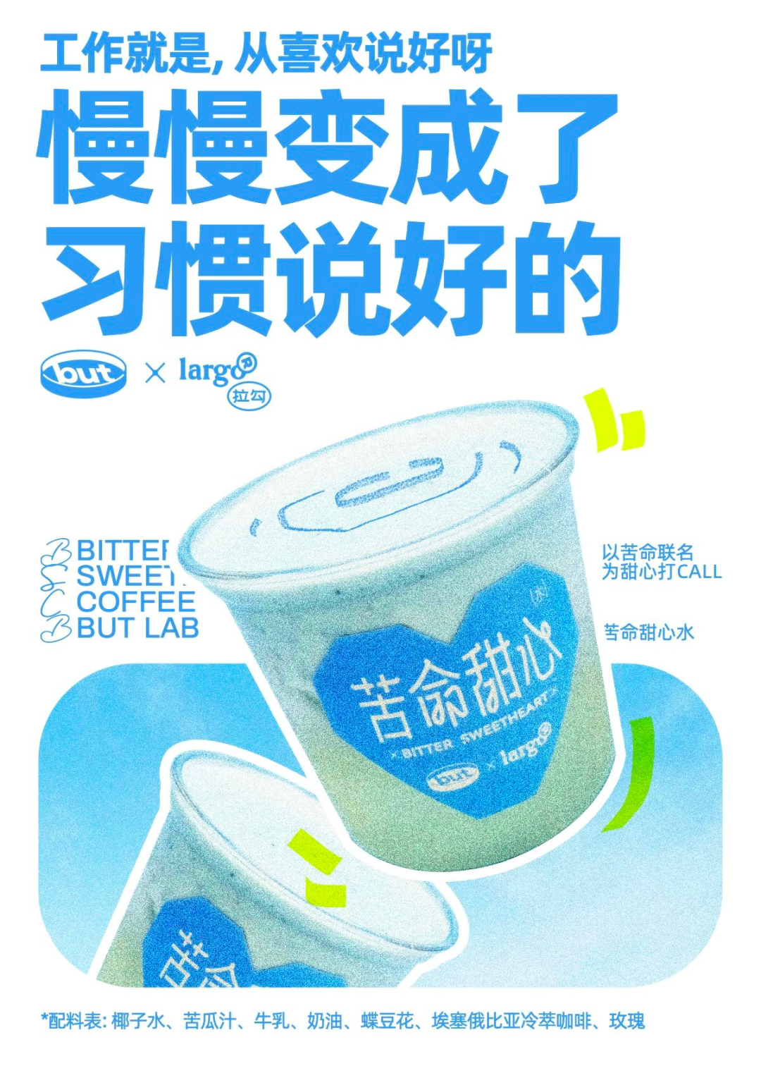 这一组文案看下来,少了一些发疯,多了一丝苦味。推广的产品是but-lab与Largo拉勾的联名咖啡。
