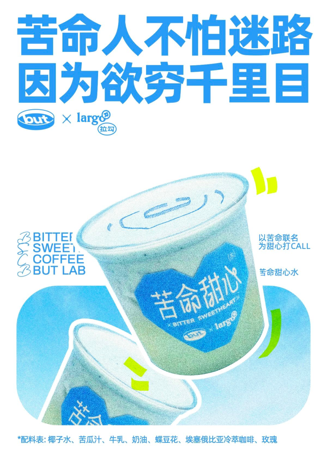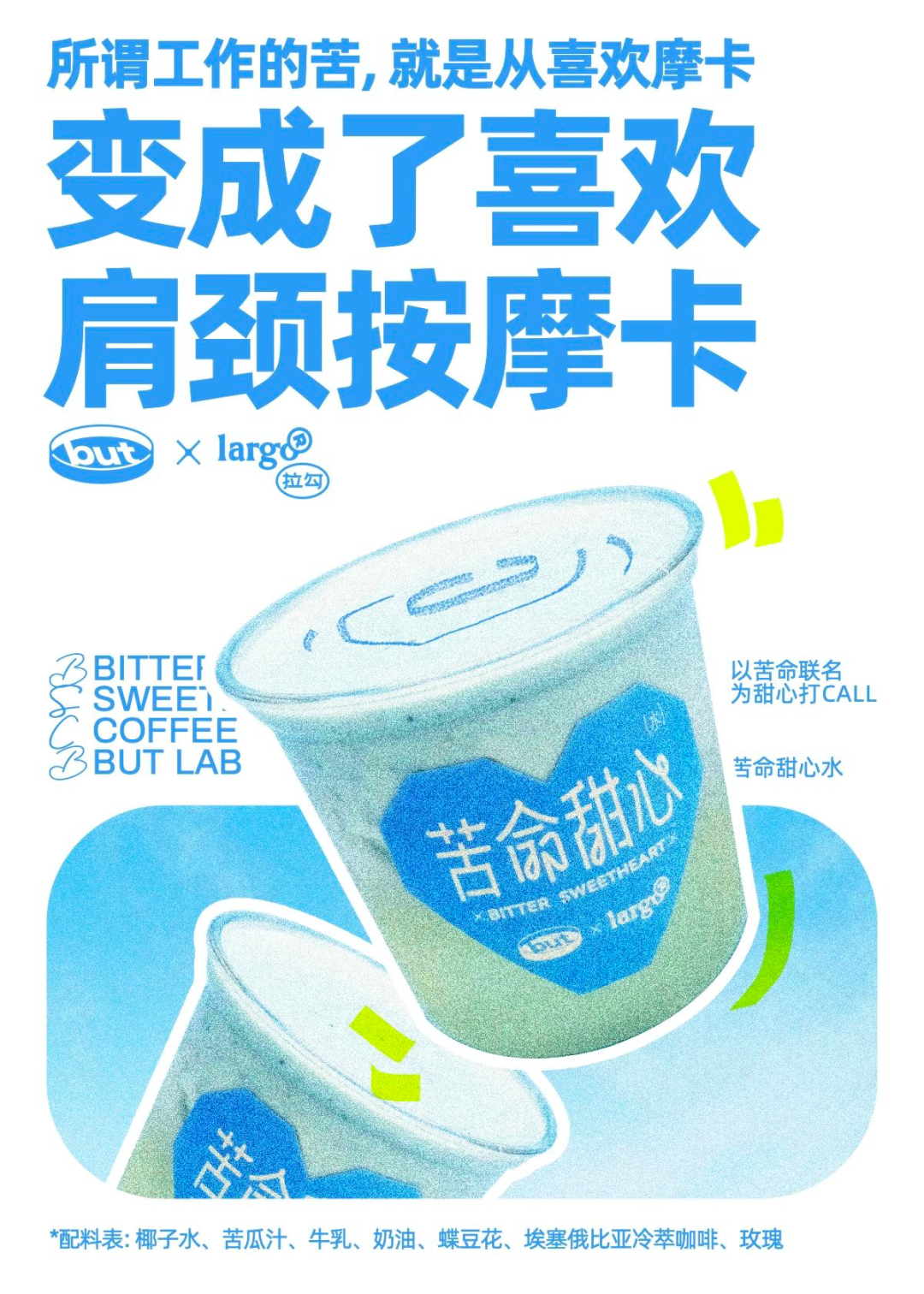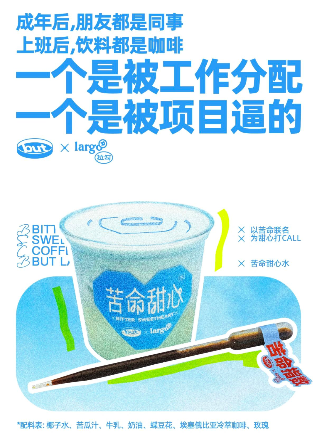 这一组文案看下来,少了一些发疯,多了一丝苦味。推广的产品是but-lab与Largo拉勾的联名咖啡。
