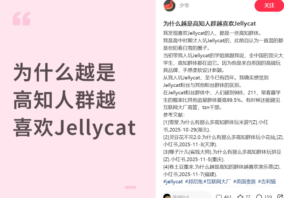 这些玩偶填补了成年人世界的情感空心区。在必须保持理性的职场、需要承担责任的社交场之外,人们需要一个不评判、不索求的温柔存在。Labubu的搞怪表情、Jellycat毛绒的柔软触感、星星人呆萌的姿态,它们不说话,却仿佛理解一切。