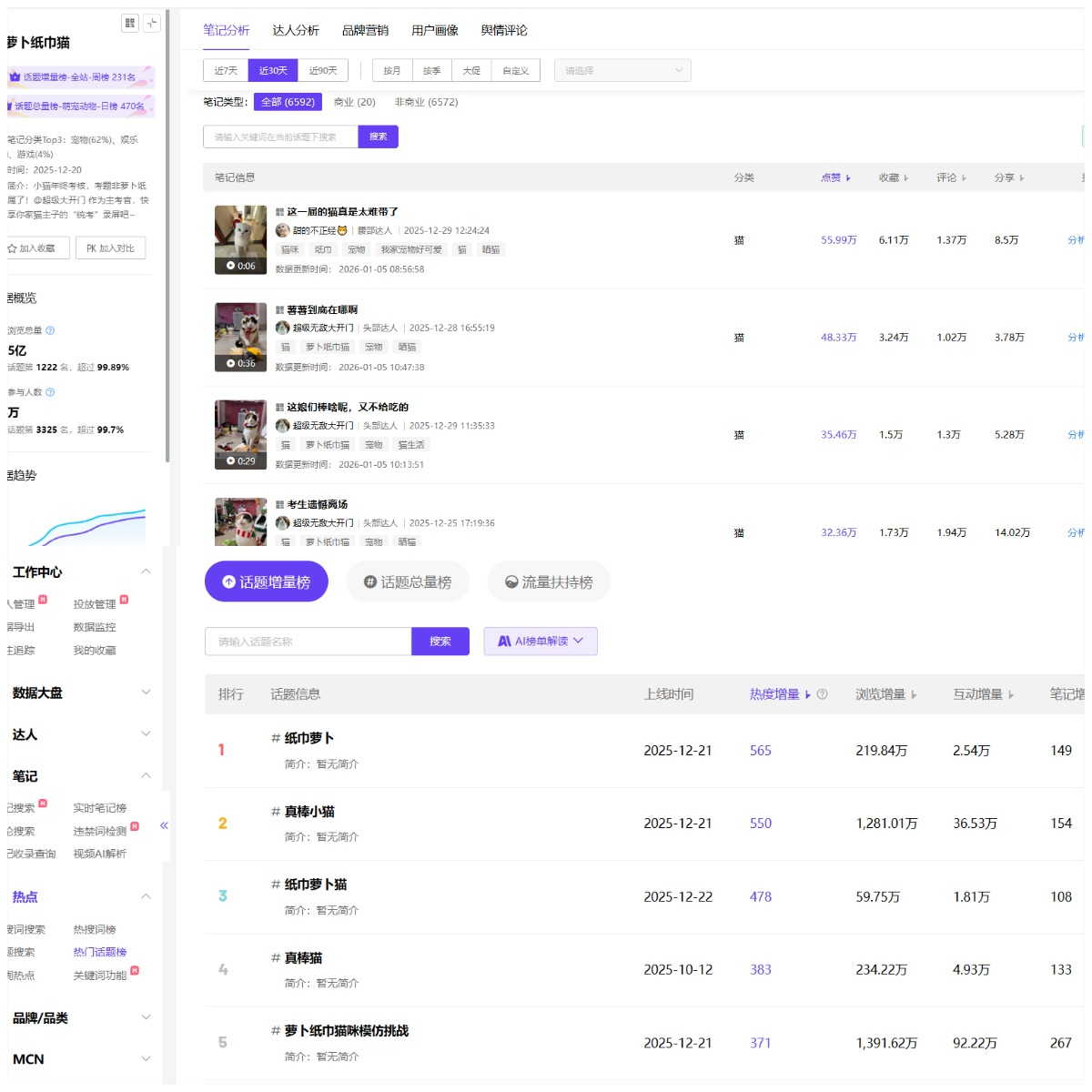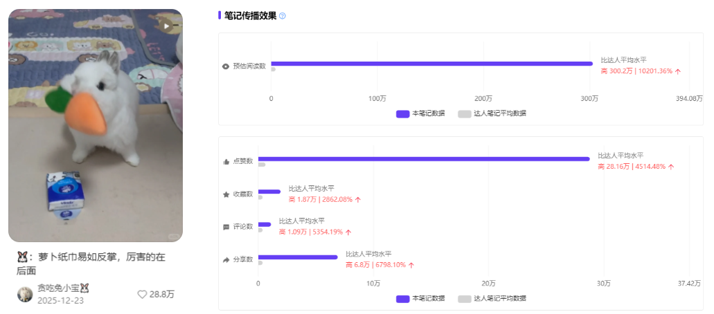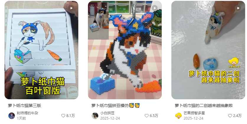 #萝卜纸巾猫 上线十天浏览量便突破2亿,相关话题#纸巾萝卜、#真棒小猫、#纸巾萝卜猫、#真棒猫、#萝卜纸巾猫咪模仿挑战 等,霸榜小红书话题增量周榜TOP5(来自千瓜数据),化身为无数人年末的“快乐源泉”与“电子榨菜”。