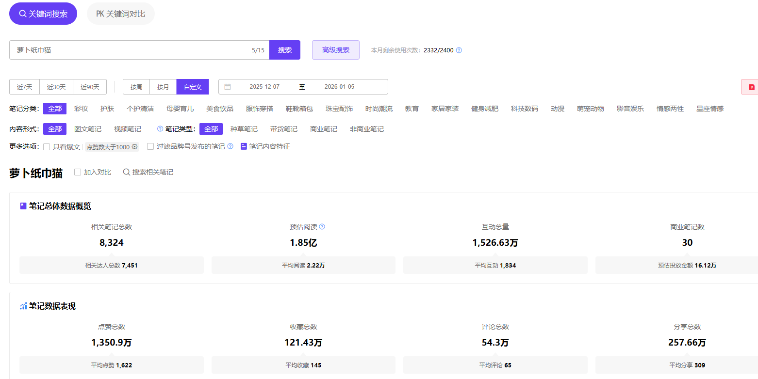用关键词功能搜索“萝卜纸巾猫”,相关笔记数达8300+篇,且平台声量极高,千瓜数据显示,近30天预估互动量达1500万+,篇均点赞数1600+,堪称现象级传播。