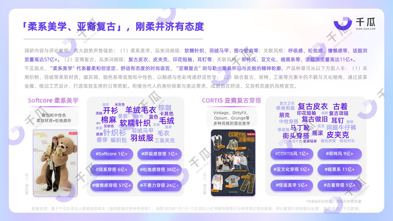 服饰穿搭:核心在于时尚态度的风格化、叙事性表达,呈现“刚柔并济”的特征。「柔系美学」运用织物、柔和色彩,传递舒适松弛、内敛而坚定的穿搭语言;「亚裔复古」借助皮革、金属等材质与做旧工艺,展露怀旧情感与反叛精神。