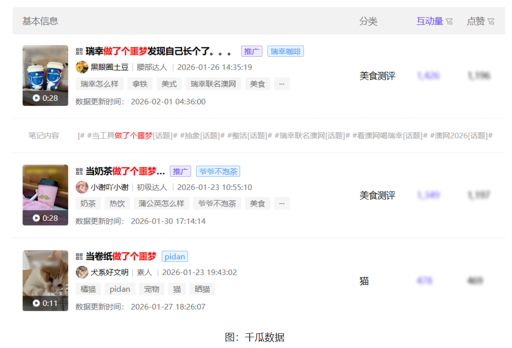 用千瓜笔记搜索功能查看商业笔记发现,瑞幸、爷爷不泡茶以及宠物品牌pidan等也敏锐地捕捉到了这一风向,通过噩梦语境完成了极具亲和力的品牌互动。
