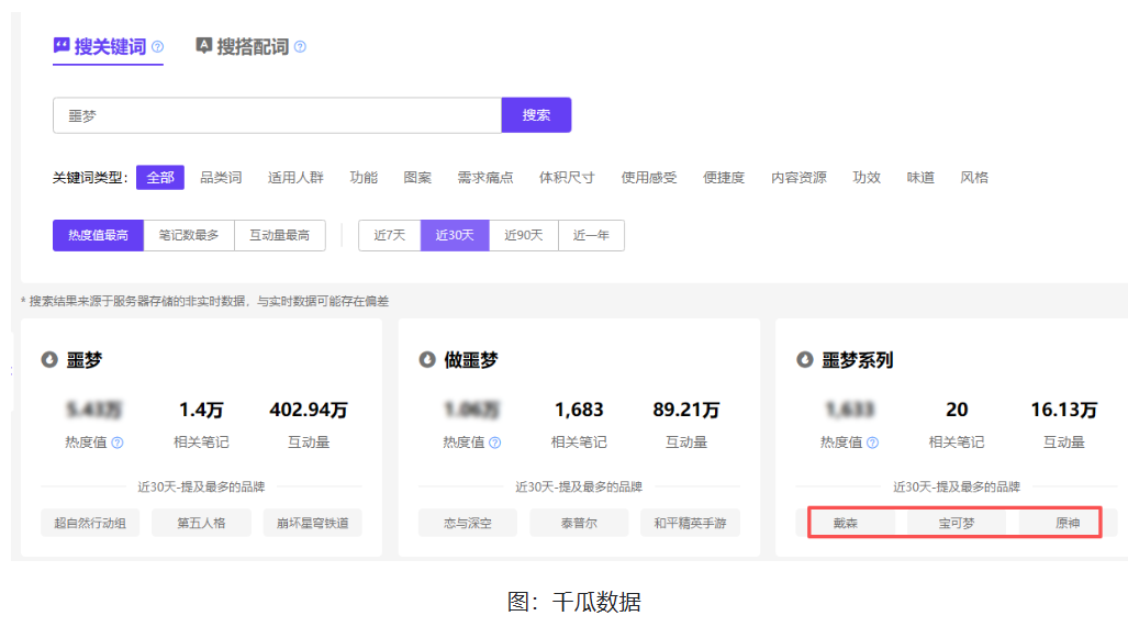 千瓜热搜词显示,噩梦、噩梦系列等关键词热度持续走红,甚至带动了戴森、宝可梦、原神等跨界关键词的联动搜索。
