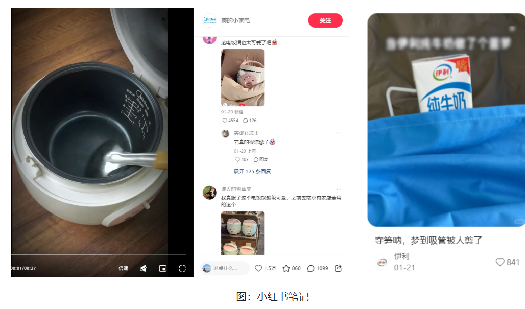 品牌官号的下场整活,将这场内容狂欢推向了商业种草的新高度。品牌们化身为“戏精”:美的电饭煲和空气炸锅轮流做噩梦,伊利纯牛奶梦到吸管被剪了......品牌官号也下场玩梗,引发用户评论围观,甚至被那个“粉色可爱电饭煲”种草。