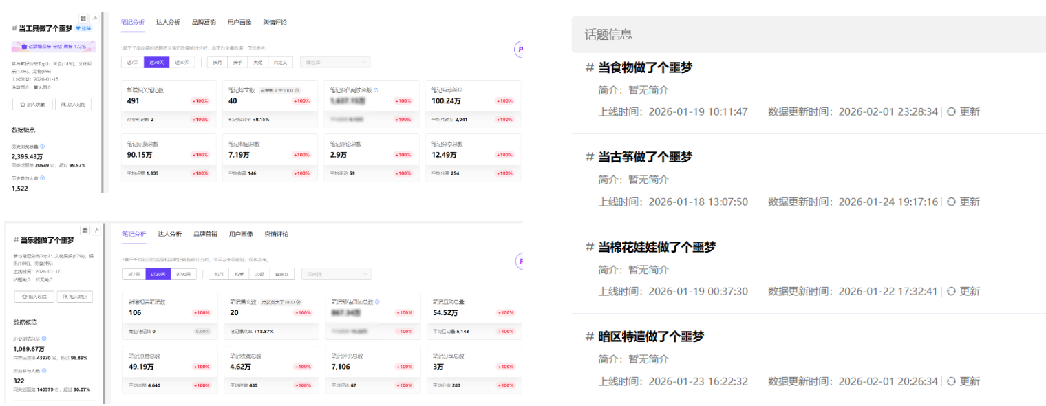 根据千瓜数据显示,话题 #当工具做了个噩梦 、 #当乐器做了个噩梦 等相关话题在短短15天内浏览量便突破千万级,笔记互动量更是高达百万级,更顺势延伸出了 #当食物做了个噩梦 、#当棉花娃娃做了个噩梦 等高度细分的垂直内容话题。