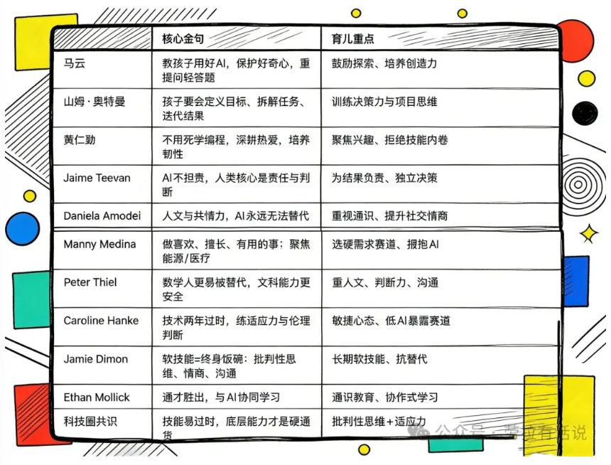 2025到2026年,AI从工具进化为智能体,教育赛道被彻底重构。马云、奥特曼、黄仁勋等全球AI大佬密集发声,他们的育儿观高度一致:不卷技术、不拼记忆、不超前训练,只守住人类不可替代的核心能力。