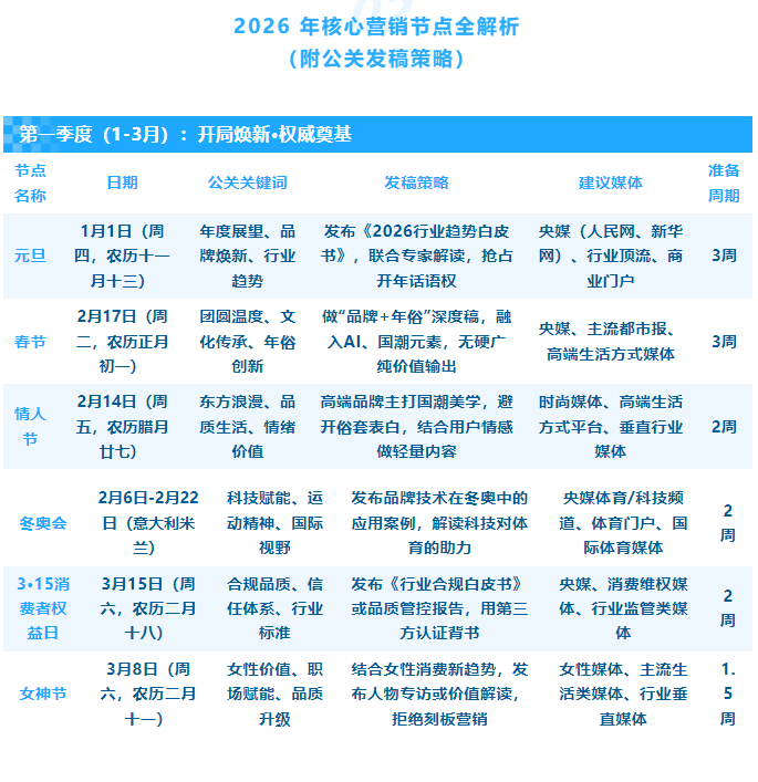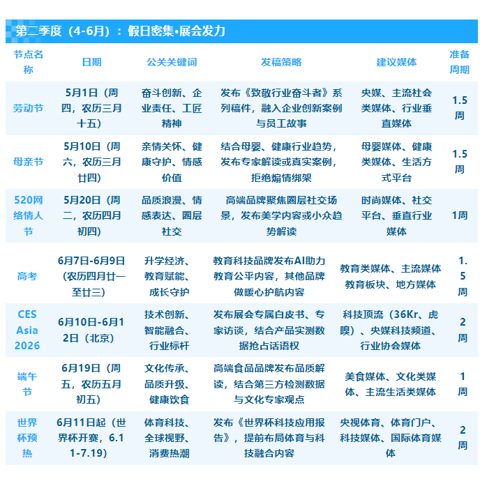 社会议题(3・15、劳动节):对接主流媒体社会板块、行业协会媒体,突出责任与价值。