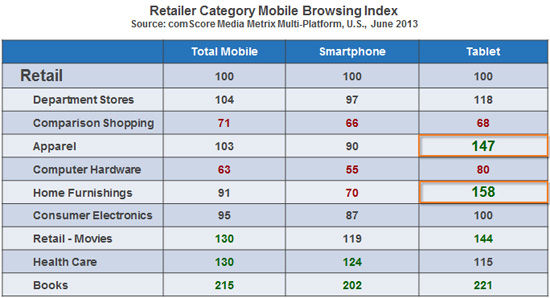 零售商和营销人员应该避免认为:在消费者如何体验一类产品方面,所有的移动接入点都是一样的。因为智能手机和平板电脑有非常不一样的特点,有时会产生很大的行为上差异。comScore对数个网上零售子品类的一个最新分析力图了解,相对在台式电脑上的活动,潜在顾客如何在智能手机和平板电脑上浏览这些品类。结果显示一些品类如电影和书籍在两个移动平台上都远超平均指数,而其他如比较购物则远低于平均指数。