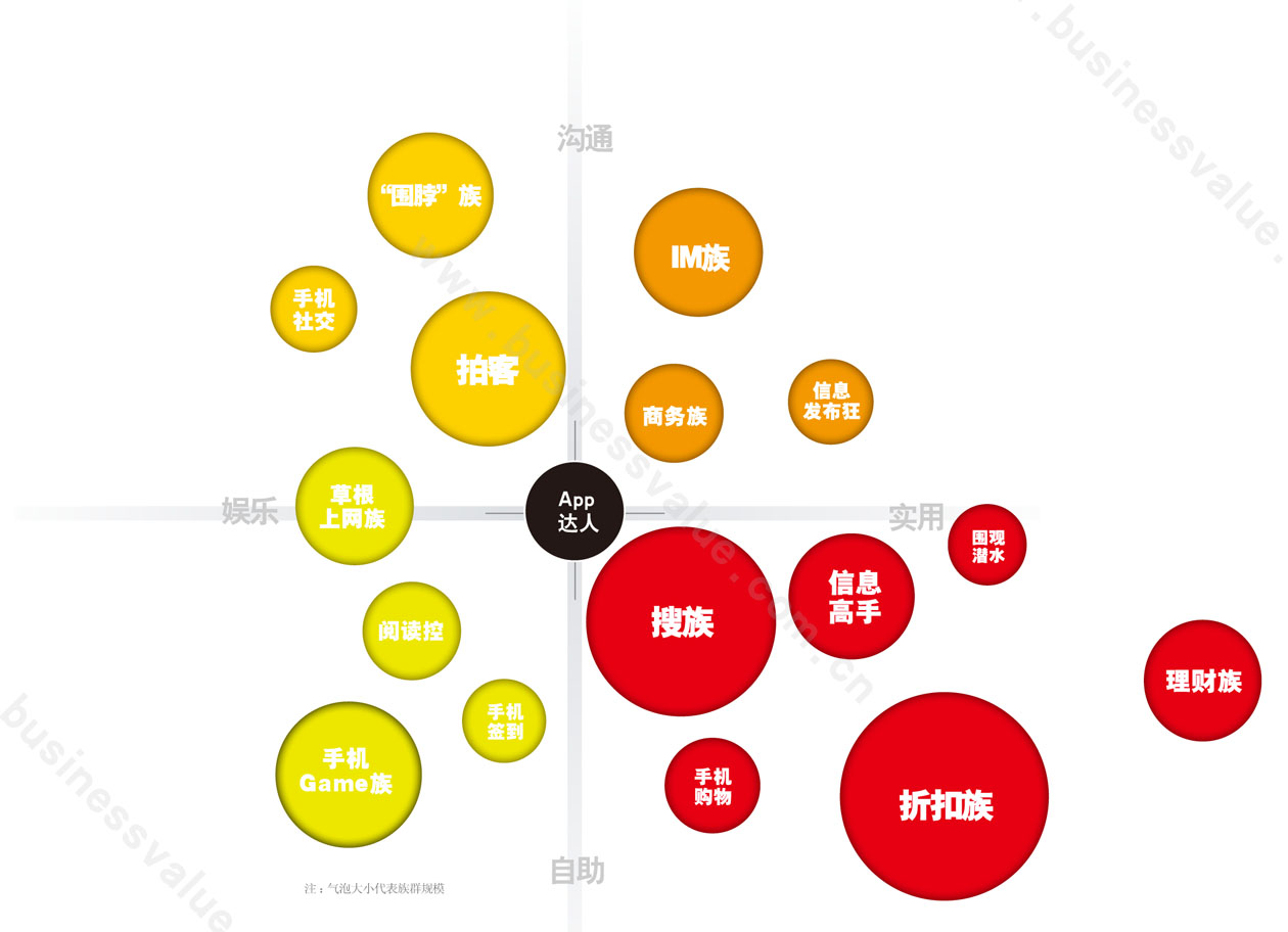 在这份研究当中,围绕沟通与自助,娱乐与实用两个主要维度,手机使用人群被划分为折扣族,搜索族,拍客族,理财族,微博族,手机购物族等17个主要细分族群,这也是从学术角度第一次将手机用户通过族群的方式进行精确划分.