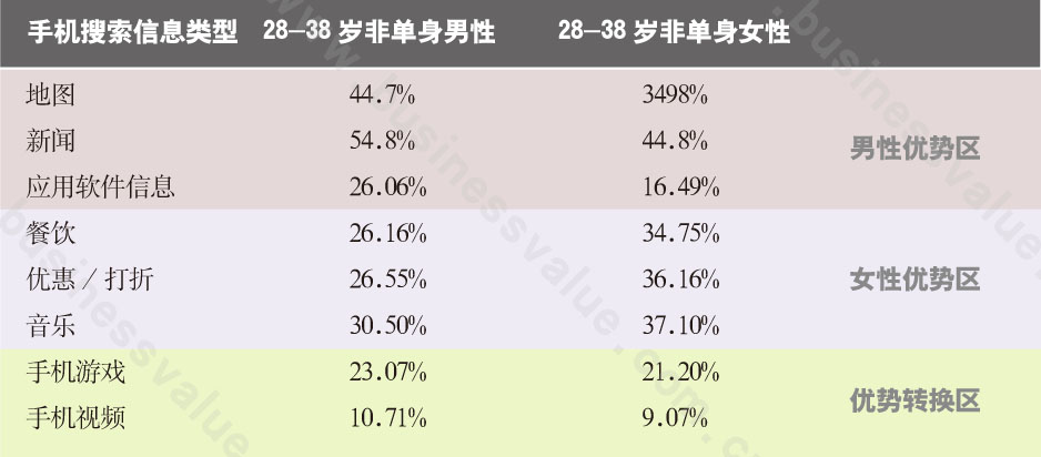 又比如以性别来划分,男性喜欢功能性搜索,女性更喜欢娱乐性搜索。这种差异造就了女性将自己更多的时间泡在手机的各种应用上面(男性偏好于在需要的时候才使用),由此带来的结果是:和由男性主导的PC时代不同,移动互联网的发展越来越受30岁左右成熟女性人群的推动。一方面从侧面解释了为何在移动平台上挤占零碎时间的休闲小游戏、拍照类应用会迅速风靡——尽管许多热门游戏简单到在游戏发烧友看来觉得“弱智”。另一方面,一个由30岁左右女性引领的移动互联网将会带来更加深远的社会影响。