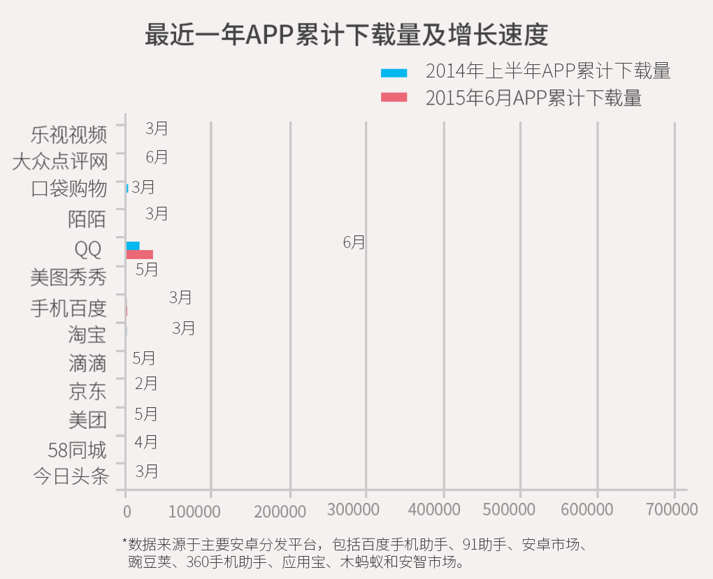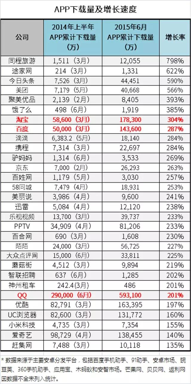 可以看出,BAT凭借其强大的品牌和渠道,移动端产品获得了快速增长,但一些新兴公司拥有了非同寻常的爆发力。最近一年中,同程旅游、途家网、今日头条、美团、聚美优品、饿了么的下载量增长速度,超过了BAT的产品。速度意味着赶超希望,更多的用户下载,意味着流量在向这几个产品集中。