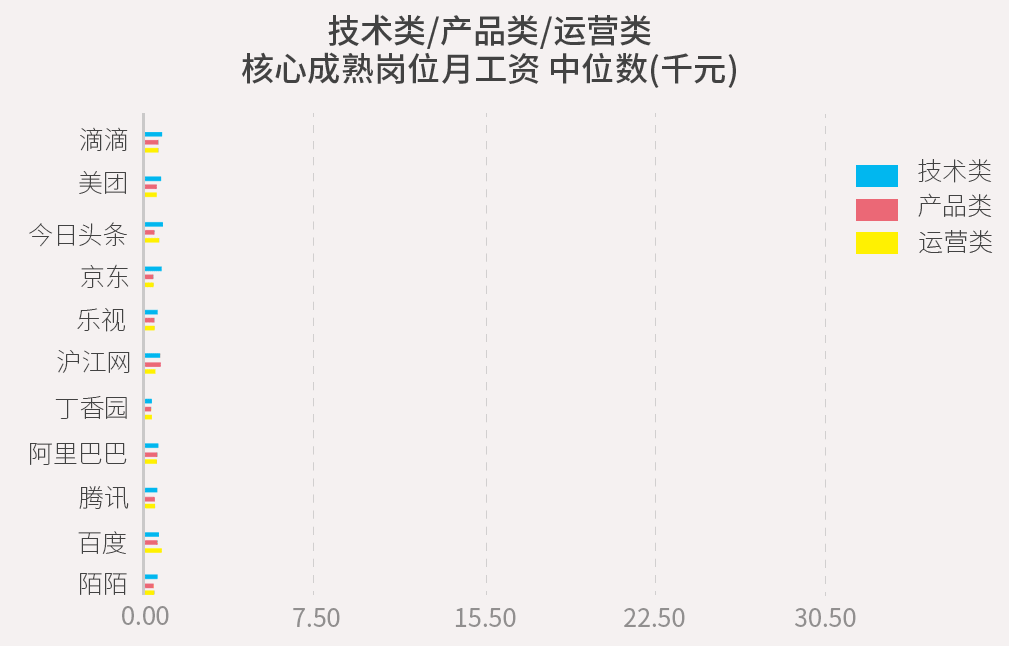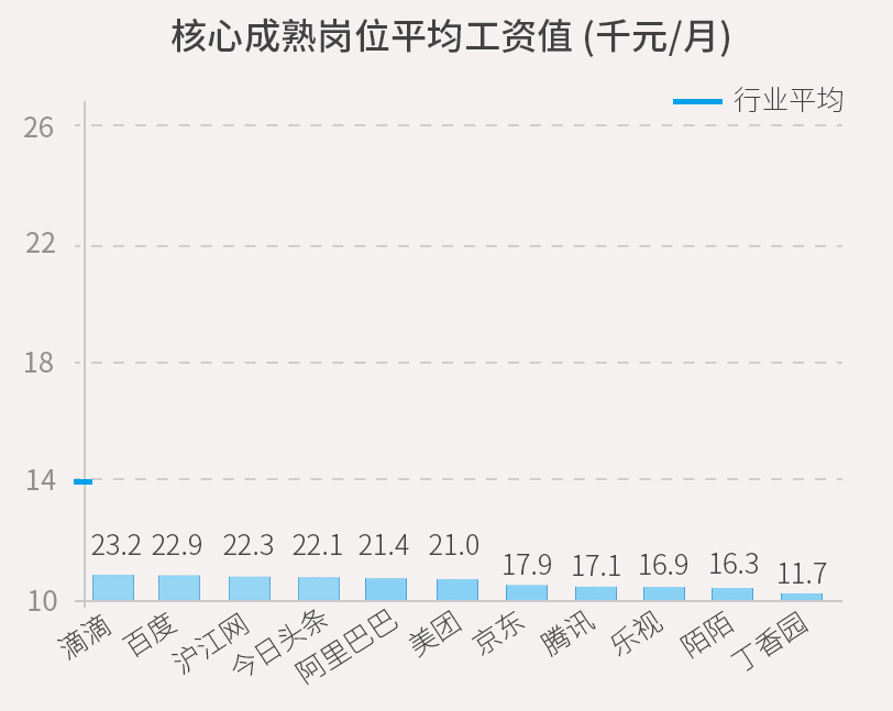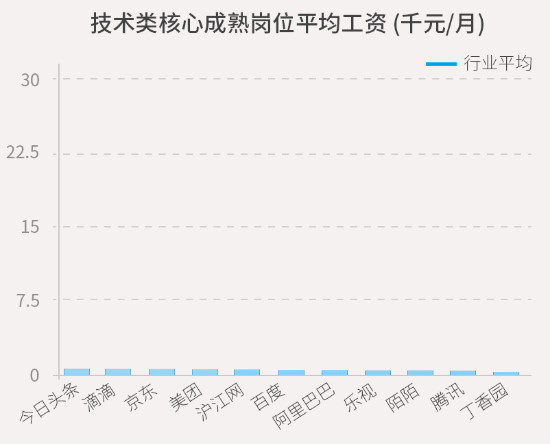 技术类核心岗位中,以数据和算法为核心的今日头条拔得头筹,给出的薪酬水平最高——28.50千元每月,比行业平均水平高出90%。滴滴次之。BAT中,以技术见长的百度,在技术类岗位上开出的薪酬最高(22.08千元每月),但BAT三家均没有进入前五。