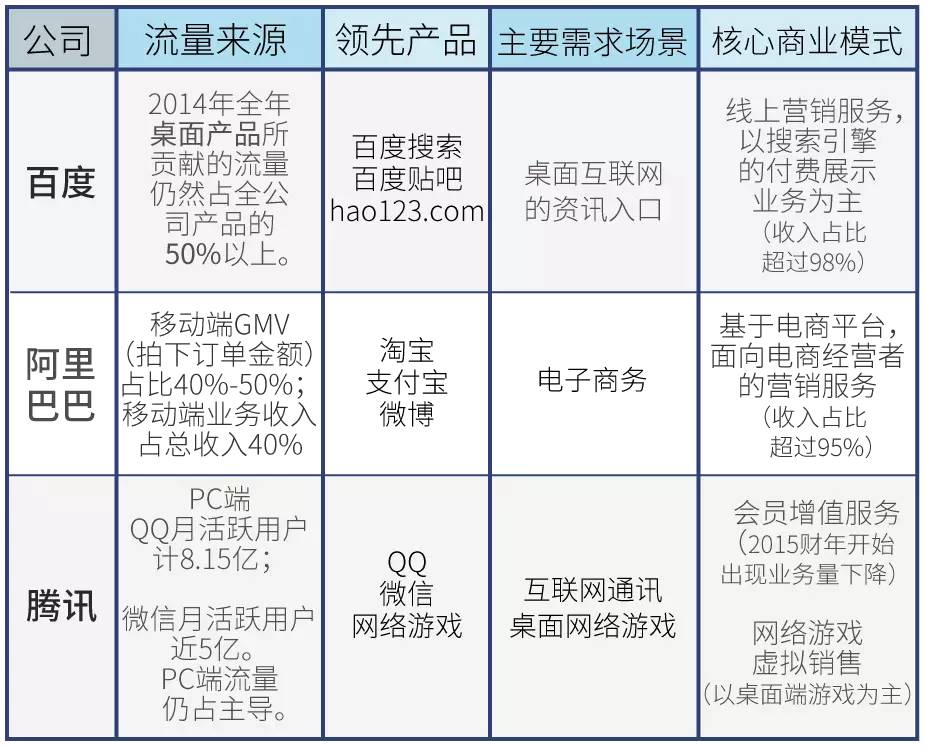 尽管BAT这样的巨头已经提前在移动互联网领域布局多年,但时至如今,来自传统桌面产品的流量、收入和需求场景,仍然构成了公司在商业上的重要支柱。