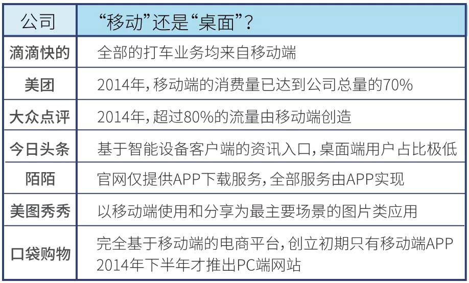 滴滴快的、今日头条、美图秀秀、陌陌等产品有一个共同的特点:你根本记不起它们的桌面网页是什么,也绝少有人在PC端去接触它们。这些产品对于PC端的依赖度降低到了一个空前的低水平线,并毫不关心从桌面而来的用户。对于这群旧秩序的“挑战者”们而言,传统桌面互联网所能提供的资源可以说是无足轻重,甚至可能被视作某种“负资产”。