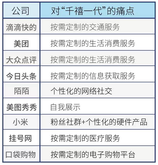 近年崛起的互联网新秀中,不难发现,其核心产品和服务的创新,基本上都围绕着“千禧一代”的消费痛点所展开: