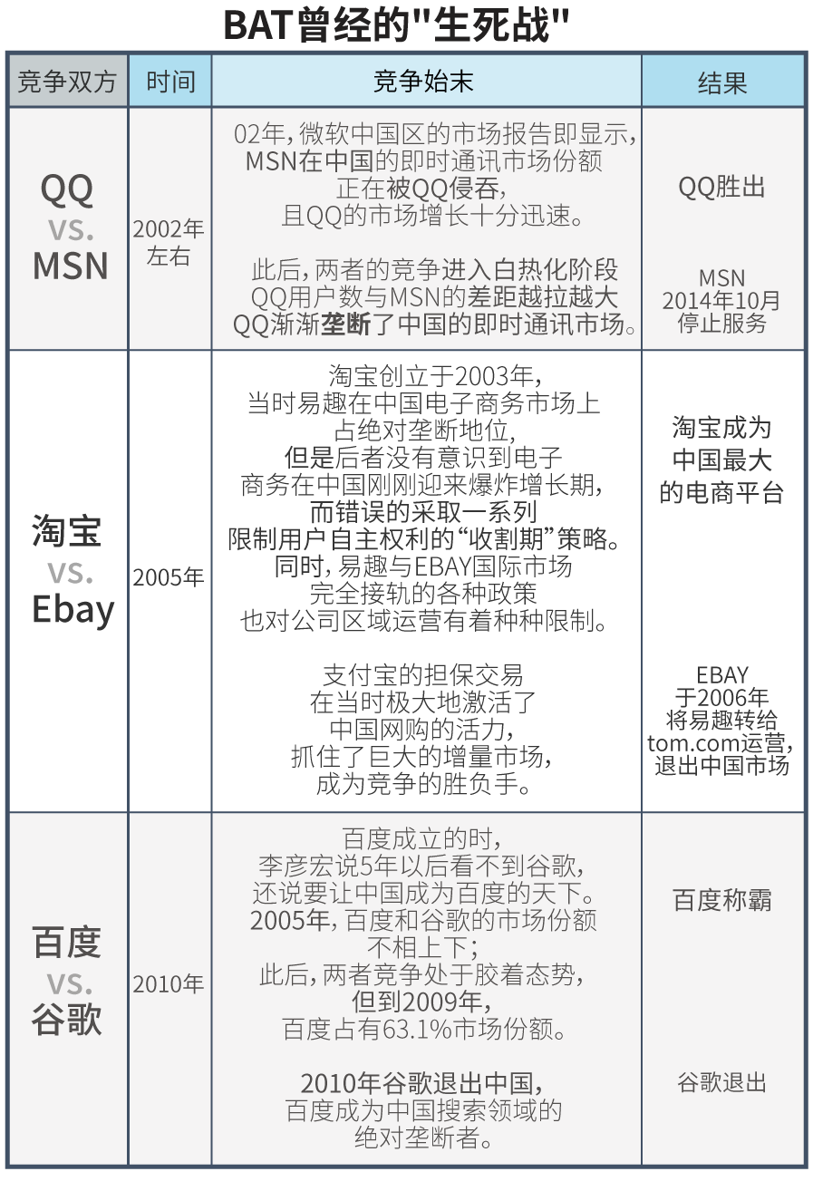 正如同1588年英格兰海军在加莱将西班牙的“无敌舰队”杀得丢盔弃甲,从而宣告属于英国的海上时代正式到来一样,与“BAT”崛起相随的,总有其他同时代强者的轰然倒塌。这包括:QQ与MSN之战,淘宝与Ebay之战,百度与谷歌之战。