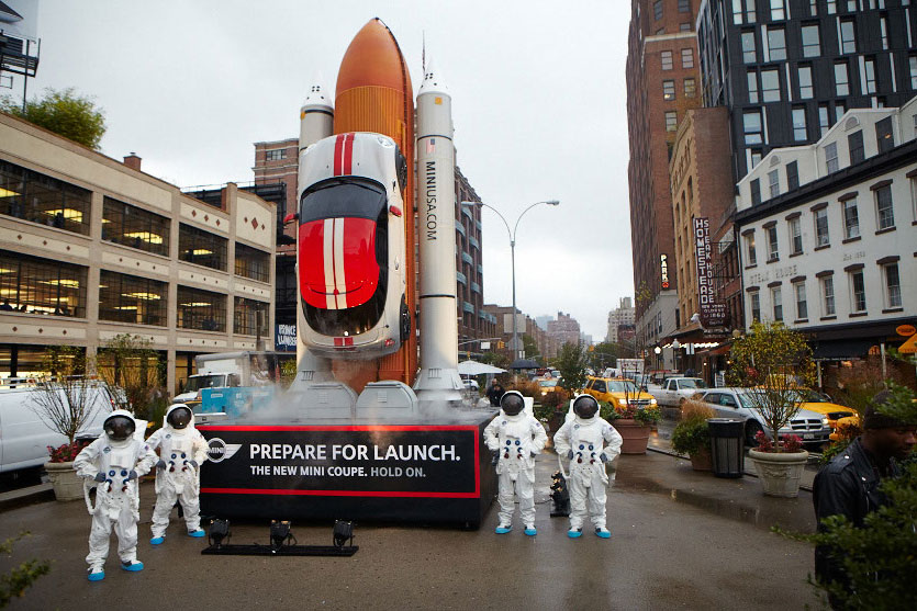 把Mini发射到太空?火星人也需要它!这不是玩笑,有人正这么干了。在人头攒动的纽约,在万圣节那天,他们拉来了真正的火箭、请来了真正的宇航员,就这样把Mini绑上去,要发射!