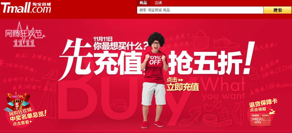 本年度光棍节,淘宝商城推出“顶品牌 赢红包”活动,每天顶满100个品牌就有机会赢取免单,邀请好友还可获得迪拜旅游机会,活动期间入驻淘宝商城的各大品牌商家在11月11日当天也有半价活动推出。