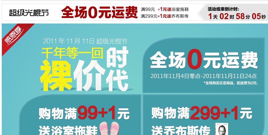 跟京东商城不一样的是,靠服装起家的凡客在广告代言上要年轻一些,从韩寒、王珞丹的“凡客体”黄晓明的“我不是演技派”,再到如今大街小巷李宇春的“生于1894”,凡客的每一次广告代言都能引起很大的共。广告效应加上优质服务,使得凡客的品牌越做越大。截至到今年的光棍节,凡客打出了“全场免运费,+1元送《乔布斯传》”的活动,既能购物又能读书,何乐而不为呢?