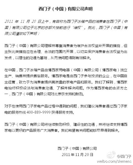 有意思的是,西门子昨日下午也在其官方网站发布了一个声明(下图),一个颇为有趣而耐人寻味的现象是,老罗与西门子的纠葛,持续了一个多月,在坊间舆论中掀起轩然大波。但我们的消费者权利保护机构,竟然无一例外地坐壁上观,没有一家介入或者试图介入展开调查。这让人悲哀地想到,哪怕是粉丝超百万、一腔义勇的老罗,面对铁板一块的商业巨擘,也不过是个小人物。他能改变的,也许只是砸与不砸冰箱的问题。
