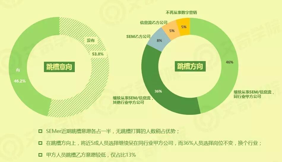 SEMer超过一般人无近期跳槽意愿。而所有甲方人员的跳槽方向上,将近5承认选择继续待在同行业甲方公司,36%选择其他行业的甲方公司,仅13%的人员想要跳槽至乙方。