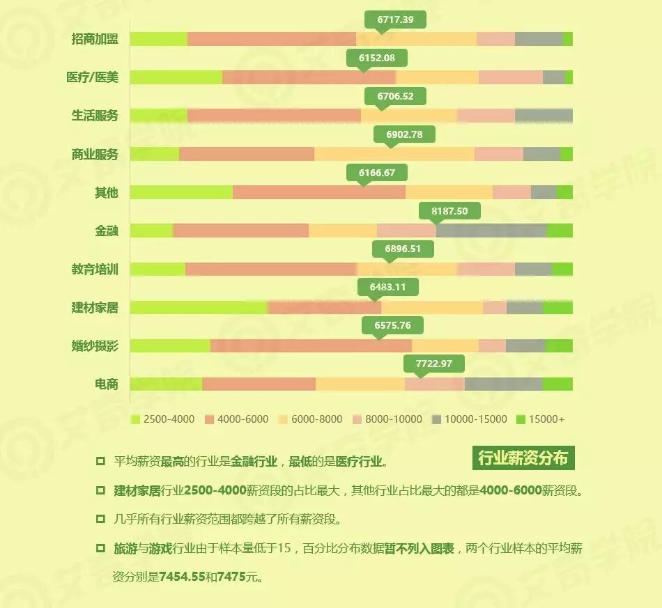 需要说明的是,由于游戏行业和旅游行业样本量低于15,数据不具备代表性,就没有放在图表中。但数据结果可以透露,游戏和旅游两大行业此次调研中,平均薪资分别是7475元和7454.55元。