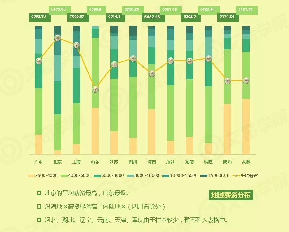 从地域来看,北京平均薪资水平领跑全国,上海紧随其后。而广东的薪资并未像“北上广”的名头那样跻身前三,而是落后于四川、福建和浙江,仅排名第六。