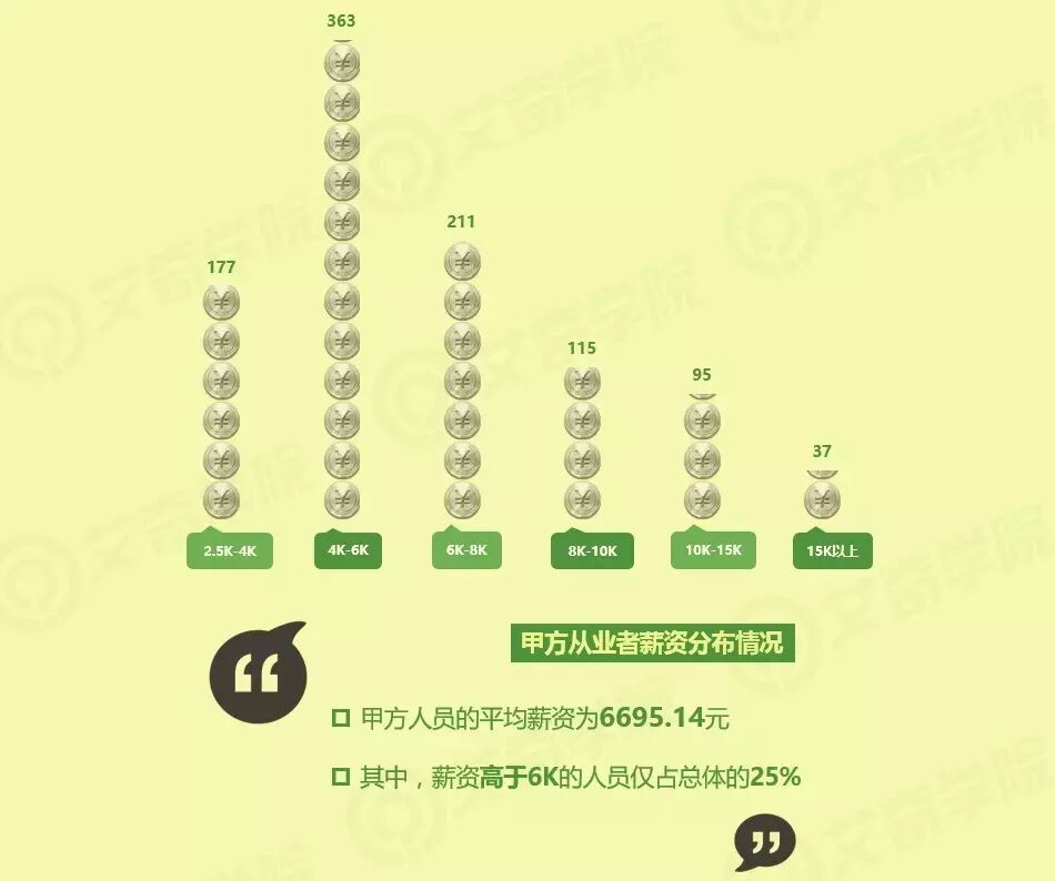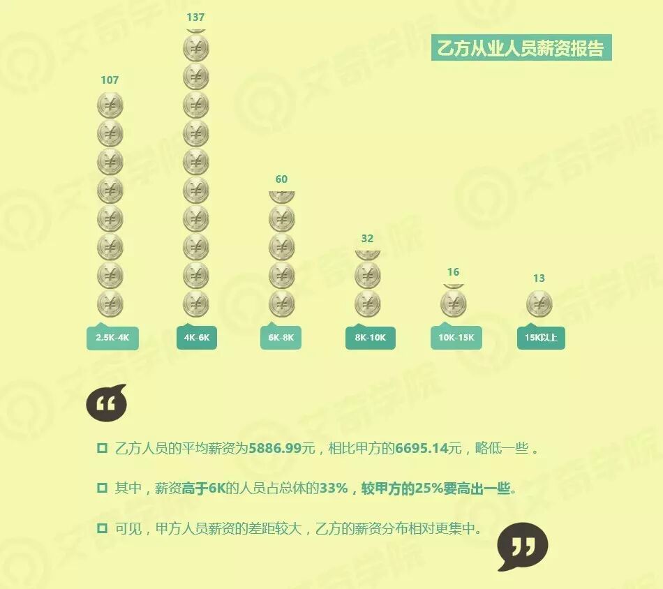 乙方人员的平均薪资为5886.99元,相比甲方的6695.14元,略低一些 。其中,薪资高于6K的人员占总体的33%,较甲方的25%要高出一些。可见,甲方人员薪资的差距较大,而乙方的薪资分布相对更集中。