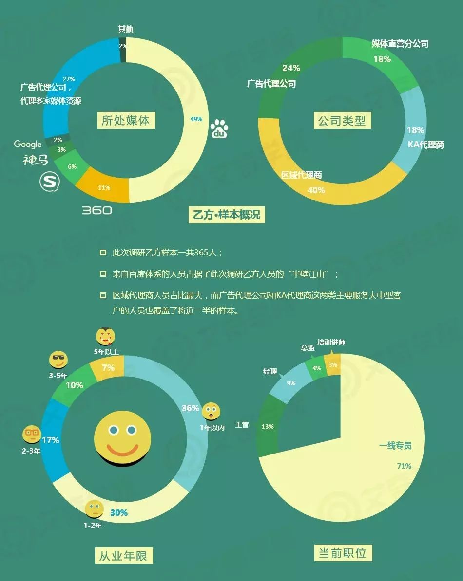 此次乙方一共回收365份有效问卷,其中来自百度体系的人员占据了“半壁江山”。另外有超过四分之一的人员,是来自广告代理公司。