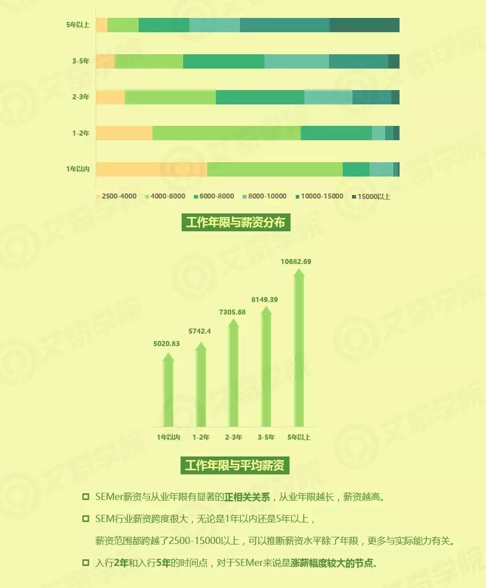 SEMer薪资与从业年限呈明显的正相关,即从业年限越长,薪资越高。但令人惊奇的是,5年以上资历的SEMer还存在4K以下的薪水,可以推断在SEM行业中,薪资除了年限,更多与实际能力和地域有关。