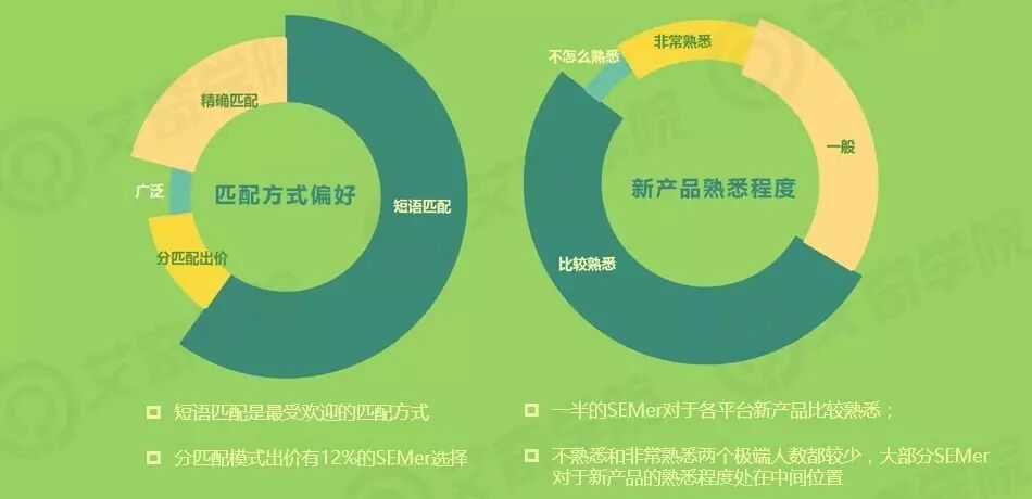 在匹配方式上,最受欢迎的是短语匹配,收到了六成从业者的青睐。广泛匹配这种高端玩家的玩法,显然不适合大多数人。而随着长尾理论的推出和渗透,也有将近四分之一的从业者选择精确匹配。另有12%的从业者选择分匹配模式出价。