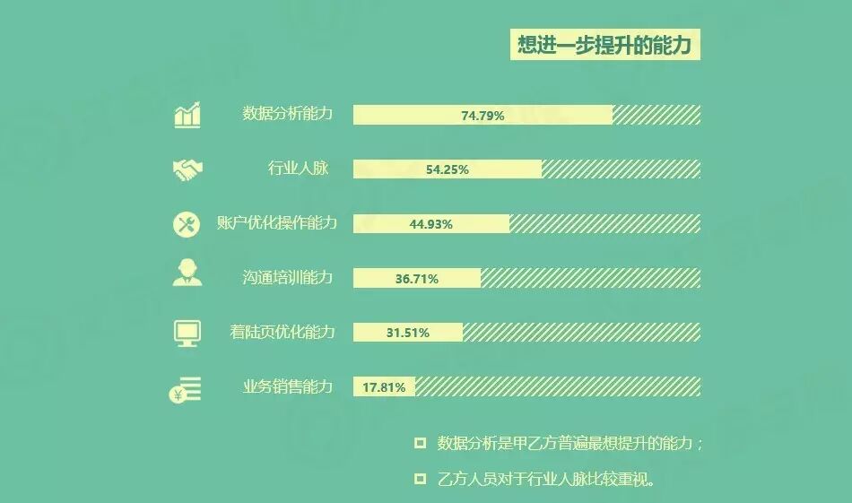 而提升能力上,乙方人员再次与甲方高度一致,最想提升数据分析能力,另外对于人脉也比较重视。
