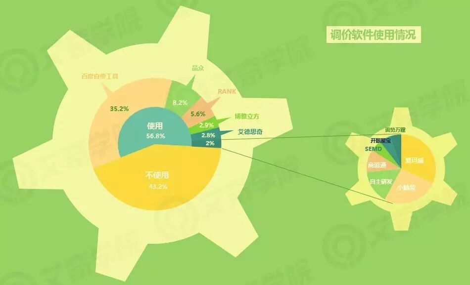 使用调价软件的从业者接近6成,而调价软件的市场大部分被百度的系统自带免费工具(排名倾向出价模式等)占据。付费市场中,市场份额最大的一次是品众和RANK,博雅立方、艾德思奇和一些小而美的品牌在争夺剩余的8%市场。