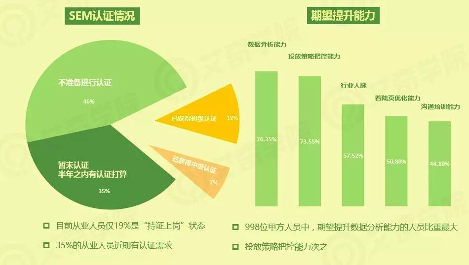 百度认证是目前国内SEM唯一具备一定含金量和权威性的职业认证(谷歌也有认证,但是在国内谷歌Adwords认证的用处远不如谷歌自家的GA分析师认证,而GA分析师偏向网站分析)。目前行业“持证上岗”的人员不多,仅占19%,而35%人员近期有认证需求。