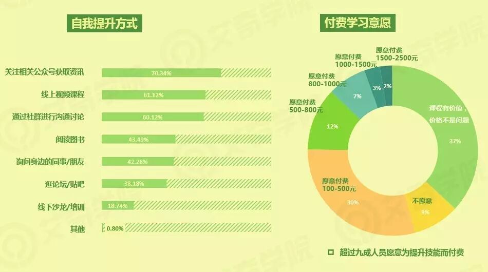 对于付费课程的态度,超过九成人员愿意为提升技能而付费,其中37%的从业者表示只要课程有价值,不会太在意课程价格。