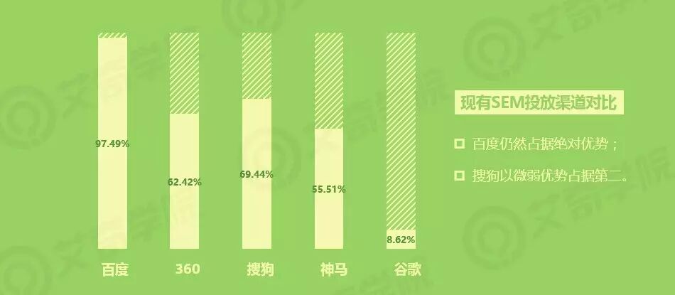 百度在现有投放的搜索引擎媒体中,仍然占有绝对优势,仅2.51%的企业没有投放百度竞价。而搜狗已经赶超360,以微弱优势占据第二位置。神马的投放占比已过半。而谷歌由于国内政策原因,暂时只能是极少数派。