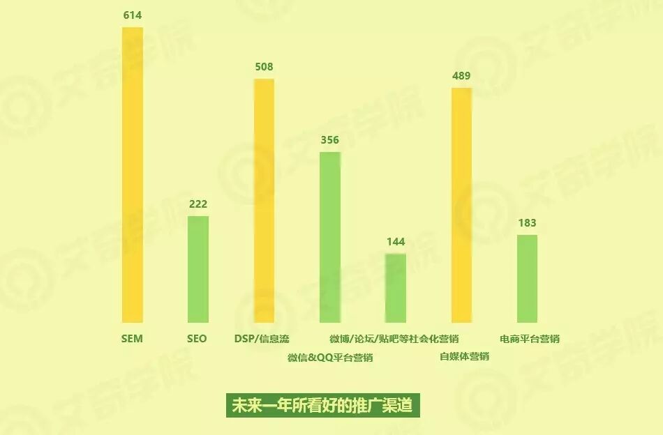 而未来一年内,SEMer最看好营销渠道,首先认同度最高的当然是SEM搜索引擎推广渠道,其次是信息流/DSP广告,另一个认同度较高的营销渠道是自媒体营销。这三个方向,一个是SEMer老本行,一个是新兴移动数字广告形式,另一个迎合了如今内容营销的大趋势。而SEO、社会化媒体等昔日PC时代举足轻重的营销渠道,认同度逐渐式微。