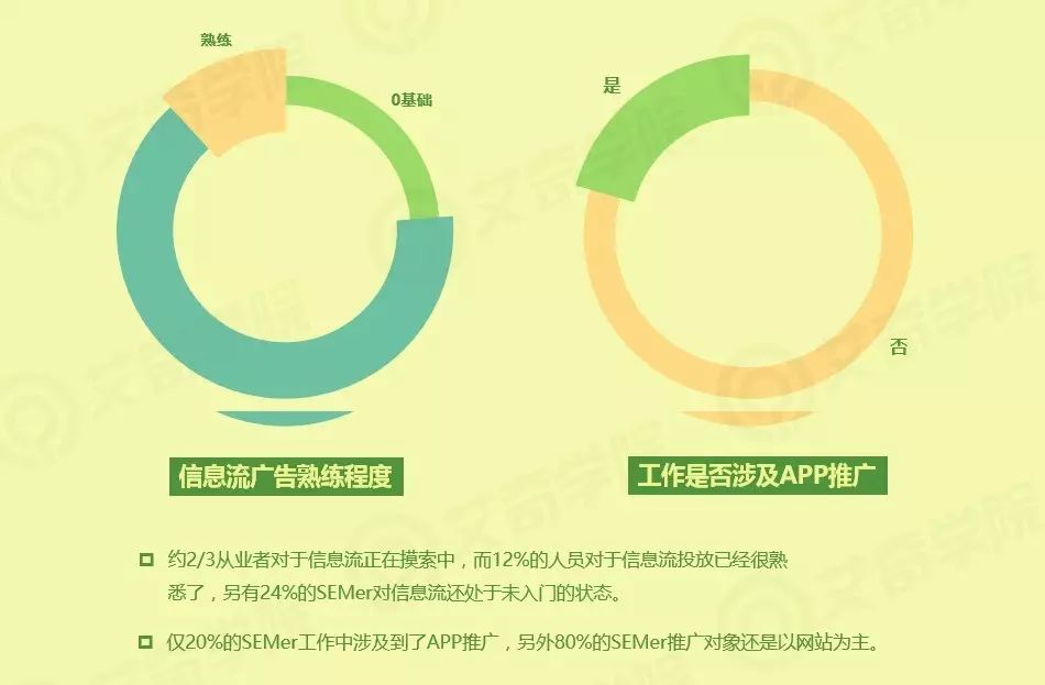 此次调研数据是在今年年初收集的,当时的绝大部分SEMer对于信息流广告还是一知半解或者完全不了解,但是观察如今信息流广告对我们工作的渗透,相信如今摸索中的比例会有所扩大,而对信息流0基础的比例会持续缩小。而推广对象上,80%的SEMer是以网站着陆页为主,仅20%人员工作中涉及到了APP推广。
