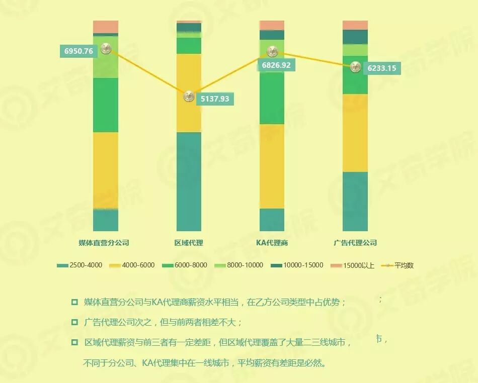 媒体直营分公司与KA代理商薪资水平相当,在乙方公司类型中占优势,广告代理公司次之,但与前两者相差不大。区域代理薪资与前三者有一定差距,但区域代理覆盖了大量二三线城市,不同于分公司、KA代理集中在一线城市,平均薪资有差距是必然。