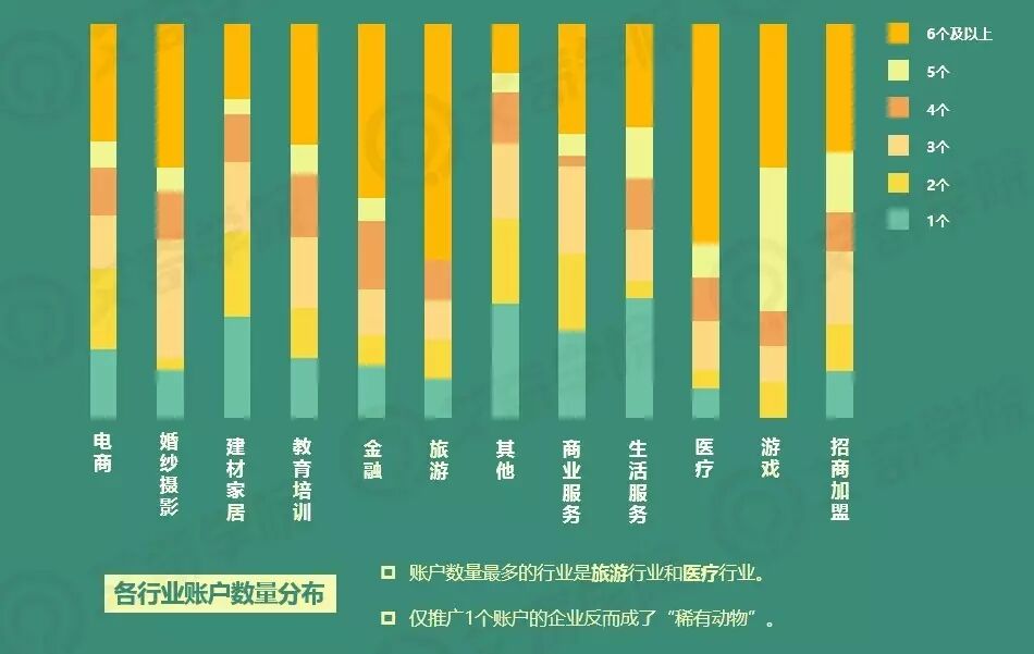 而账户数量上,旅游行业和医疗行业中,超过半数团队有6个以上账户。生活服务、建材家居和其他行业1个账户占比相对较大,在这三个行业以外的行业中,2个及以上账户数更加普遍,而游戏行业最少有两个账户。